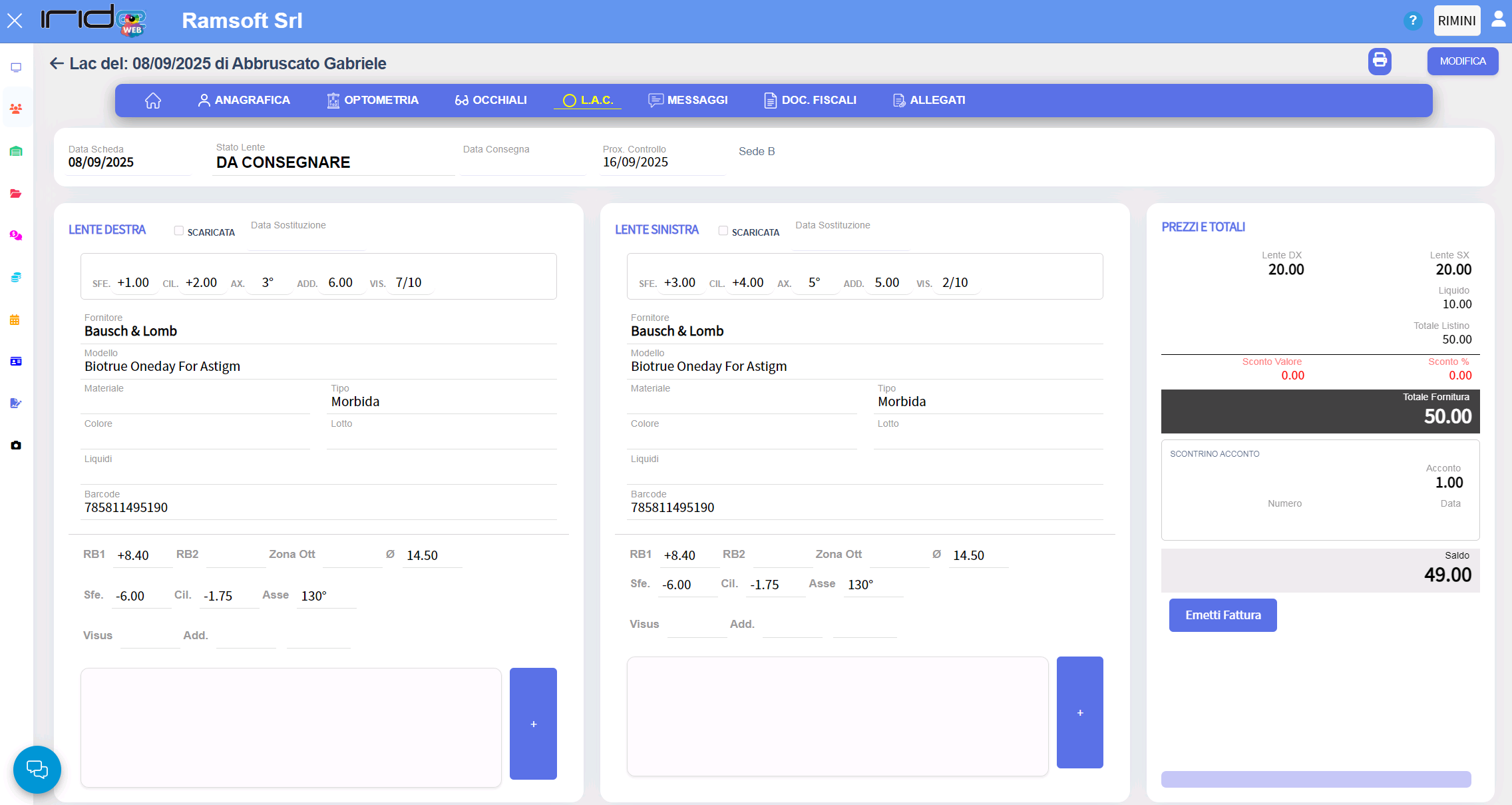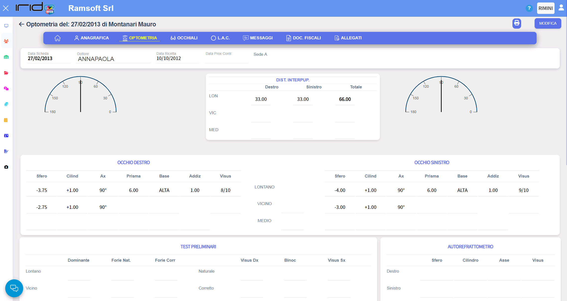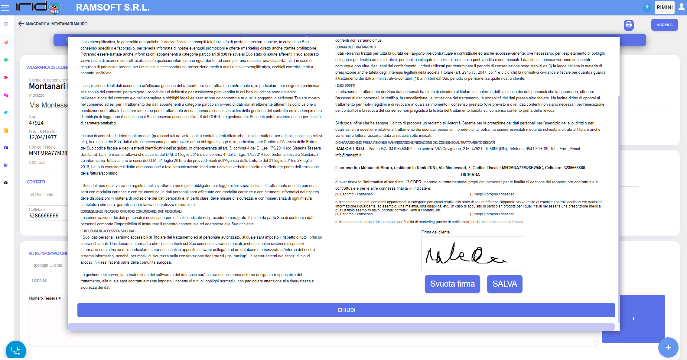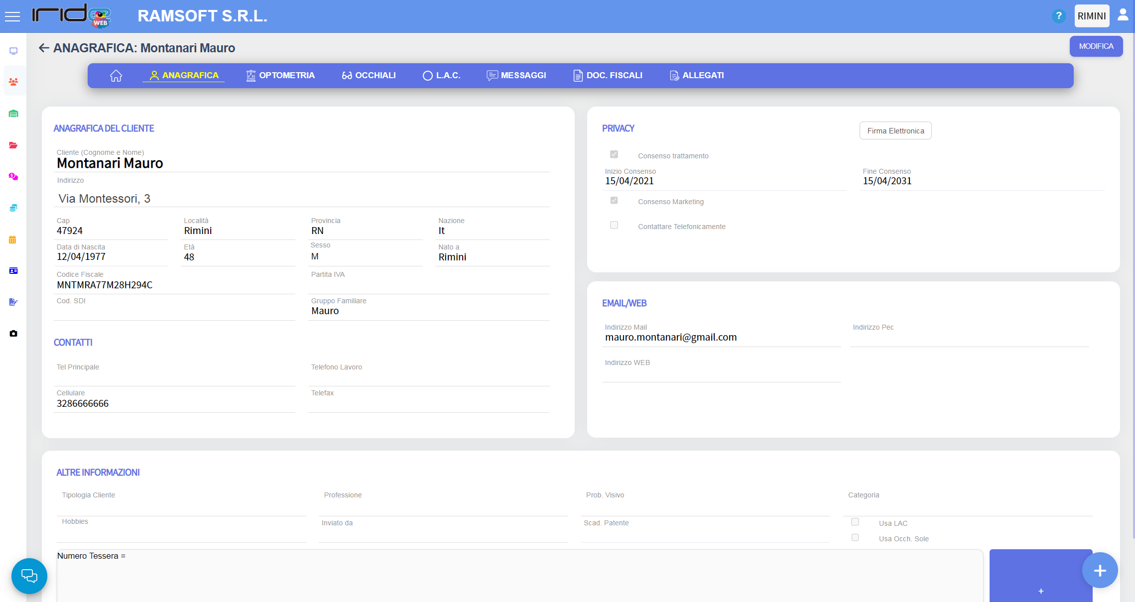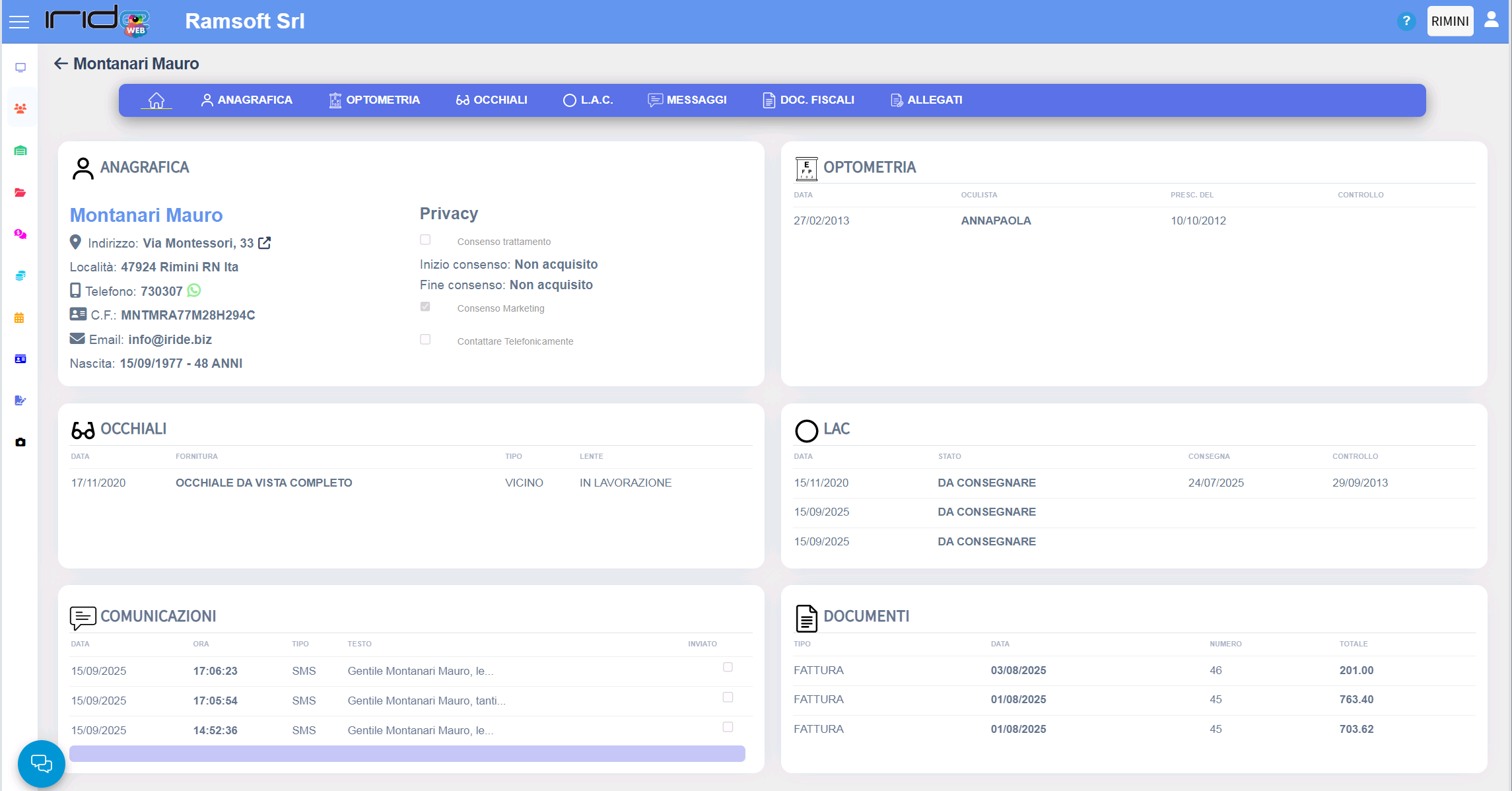 Attraverso un’unica schermata, è possibile visualizzare un riepilogo dei dati anagrafici del cilente, le schede optometriche registrate, le buste lavoro occhiali e lenti a contatto, le comunicazioni via SMS o WhatsApp effettuate e i documenti di vendita emessi. Puoi inoltre firmare i tuoi documenti grazie alla firma elettronica integrata