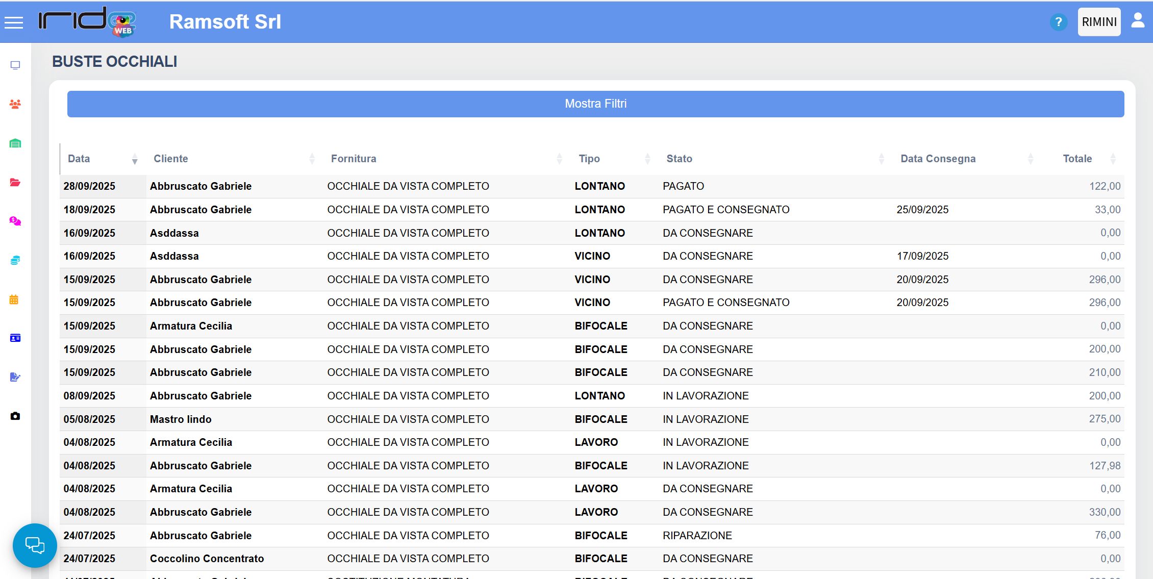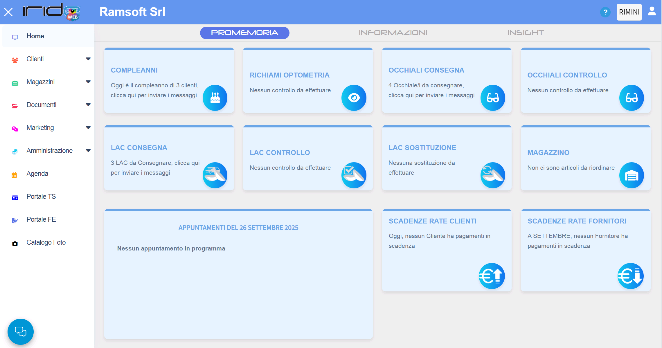 IRIDEWEB è la soluzione in cloud, che ti permette di gestire clienti, magazzini, amministrazione e appuntamenti ovunque ti trovi, in tempo reale, da qualsiasi dispositivo e da qualsiasi posizione. La schermata di avvio, attraverso la quale è possibile monitorare consegne di occhiali e lenti a contatto, tenere traccia di appuntamenti e promemoria, gestire il magazzino in modo intelligente e accedere rapidamente a tutti i documenti e portali necessari.