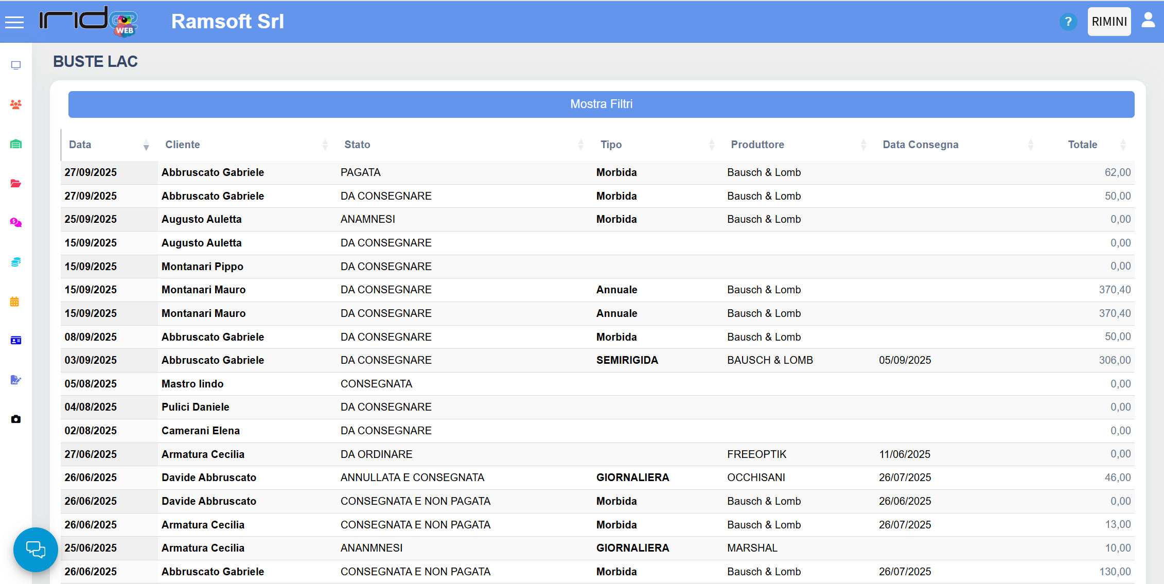 La scheda Stato di Lavorazione Buste Lac ti permette di monitorare passo passo lo stato di lavorazione delle Lenti a Contatto (‘lavorazione’,’da consegnare’, ‘pagata e consegnata’, etcc.) di tutte le buste lavoro registrate, consentendo l’invio automatico di Sms o WhatsApp al cliente per la consegna finale o per conoscere il grado di soddisfazione sull’ utilizzo.